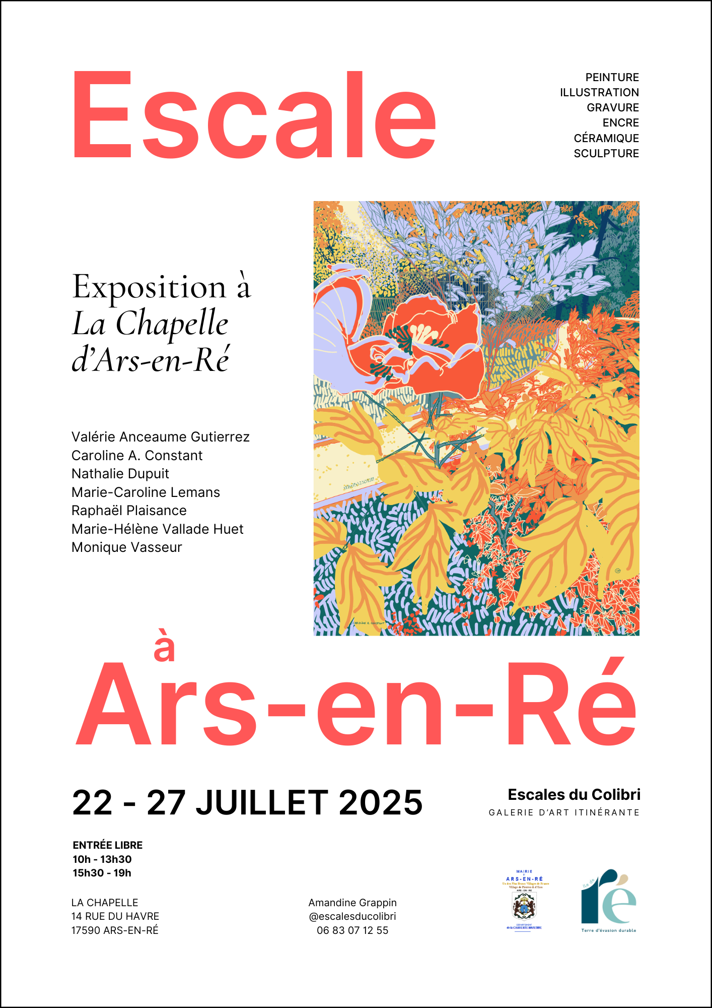 La prochaine exposition collective Escale du Colibri, par Amandine Grappin, aura lieu à La Chapelle d'Ars-en-Ré, sur l'Île-de-Ré (17), du 22 au 27 juillet 2025.