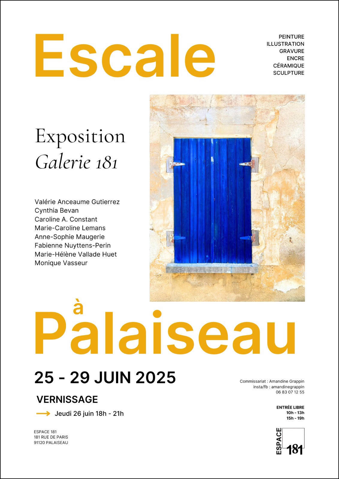 La prochaine exposition collective Escale du Colibri, organisée par Amandine Grappin, aura lieu à la Galerie 181 à Palaiseau (91).
